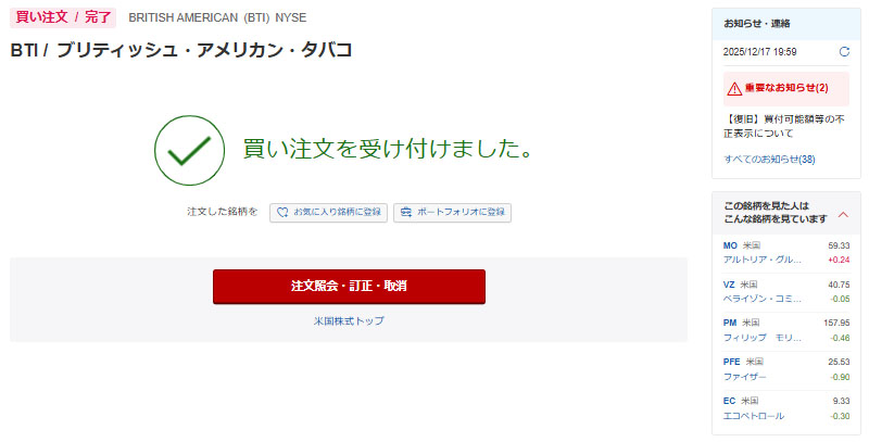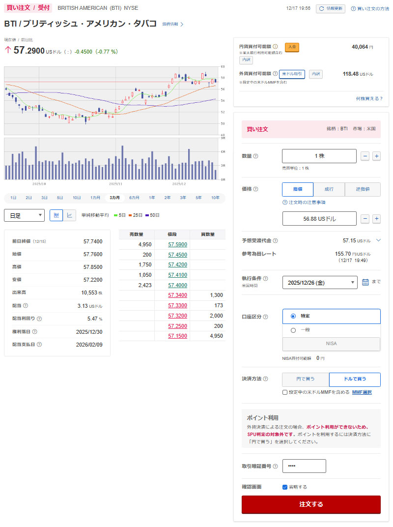 KHCの代わりに「米国高配当株8銘柄」で買いはじめた「ブリティッシュ・アメリカン・タバコ(BTI)」を1株追加しました。