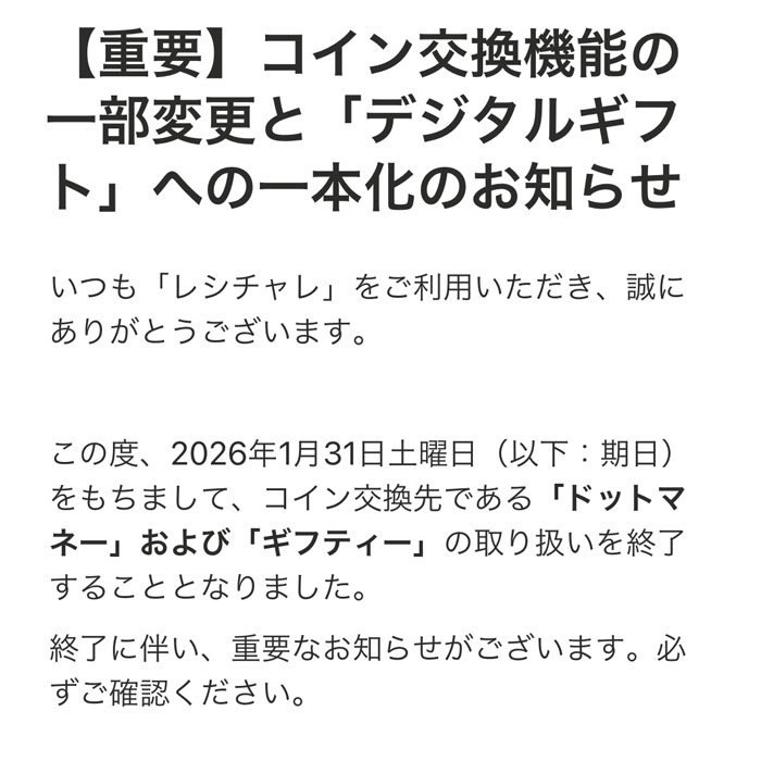 来年の1月31日で「レシチャレ」のコインがドットマネーに変換できなくなるそうです。