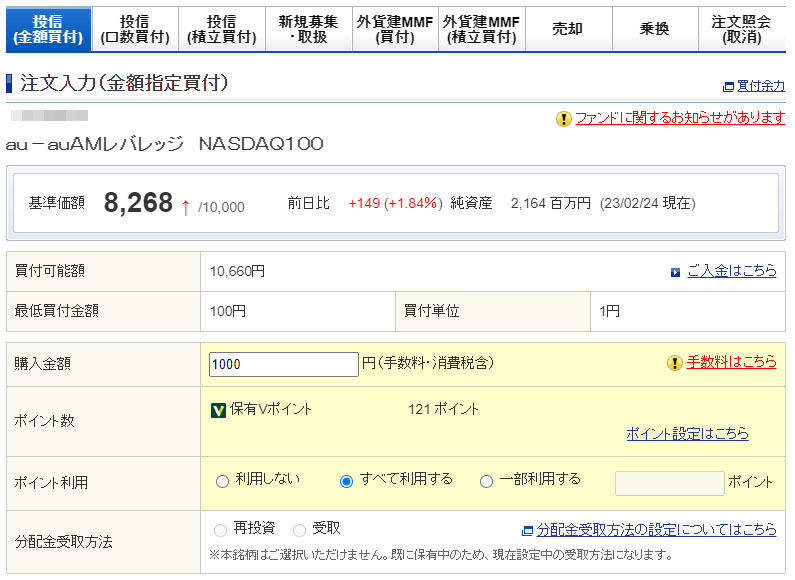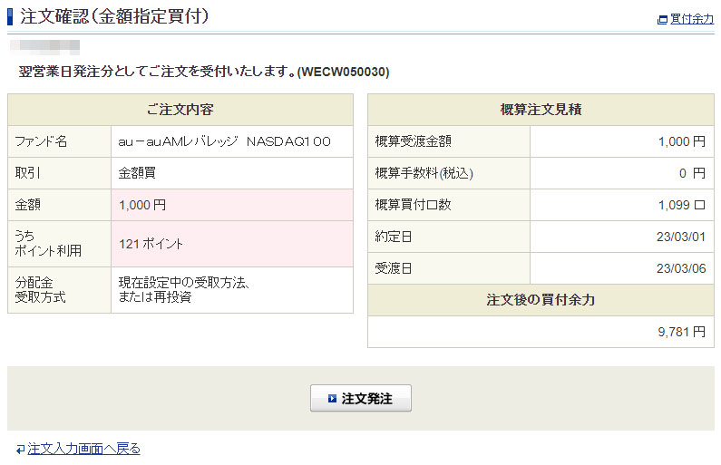Vポイントが入ったのでauAMレバレッジNASDAQ100を1,000円分追加|2023.2.27 コメントを残す そして半分を「auAMレバレッジNASDAQ100」に使い1000円分追加投資 今月はカードを少し使い過ぎで・・・楽天の方は77,000円超えました。。。合わせると約10万円 もちろん積立投信のクレカ決済も含まれてますが・・・。調子に乗って使い過ぎました。 来月(3月)は緊縮しなければ!なので来月はこんなにポイント付かないと思います。 今回は残り「すべて利用する」です 現金の持ち出しは879円となります。 受付完了!