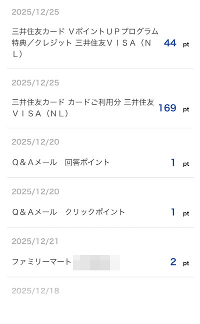 「三井住友カード VポイントUPプログラム特典/クレジット 三井住友VISA(NL)」44ポイント・・・???ん?聞いたことのないポイント。それと「三井住友カード カードご利用分 三井住友VISA(NL)」分の169ポイント。その他、何時もの細かいので合計225ポイント。