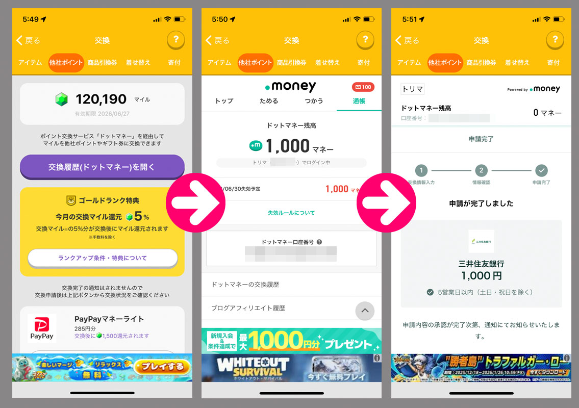 トリマで貯めたマイルをドットマネーに変換からの換金へ|2025.12.29 トリマのマイルが120,000を超えたので換金の手続きをしました。 トリマは三井住友銀行口座に紐づいています。 換金は年明けだろうと思います。市場も明日で終わりなので投資に回すのも来年です。