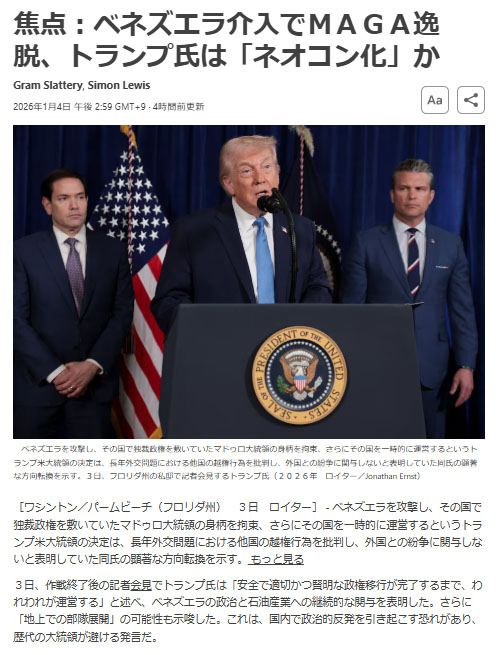 Reuters 焦点:ベネズエラ介入でMAGA逸脱、トランプ氏は「ネオコン化」か(2026.1.4より)
