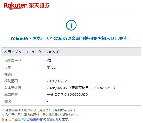 ベライゾン・コミュニケーションズ(VZ)配当予告 2026.2月分 米国の高配当銘柄「ベライゾン・コミュニケーションズ(VZ)」の2月の配当情報メールが楽天証券から届きました。 7株保有しています。 ========(以下、コピペw)======== $0.6900×7株=$4.83 $4.83×0.9=$4.347 $4.347×0.79685≒$3.46・・・前回は$3.48でした。 ===========================