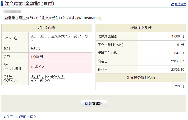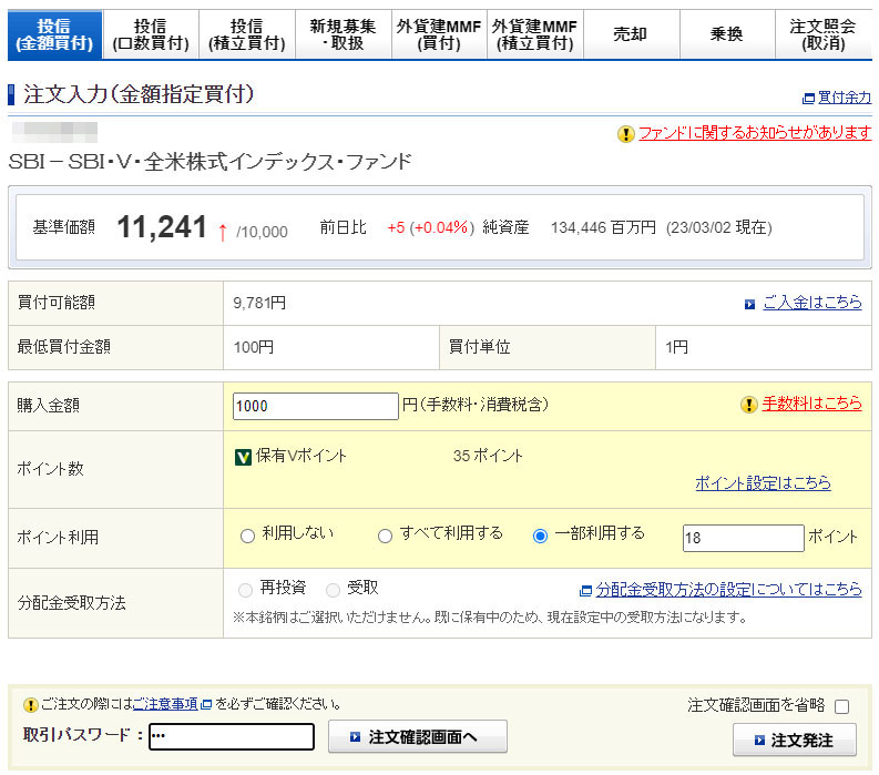 Vポイントが入ったのでSBI・V・全米株式インデックスファンドを1,000円分追加|2023.3.3 コメントを残す 2月の投信積立のカード決済分のVポイントが入りましたので今回も1000円づつ入金します。 毎月7,000円積み立てていますので0.5パーセント(7000x0.005)で35ポイント ゴールドカードなら1%なのですが・・・。 今回も35ポイントの半分で18ポイントを「SBI・V・全米株式インデックスファンド」に使います 口座からの持ち出しは982円 受付完了!