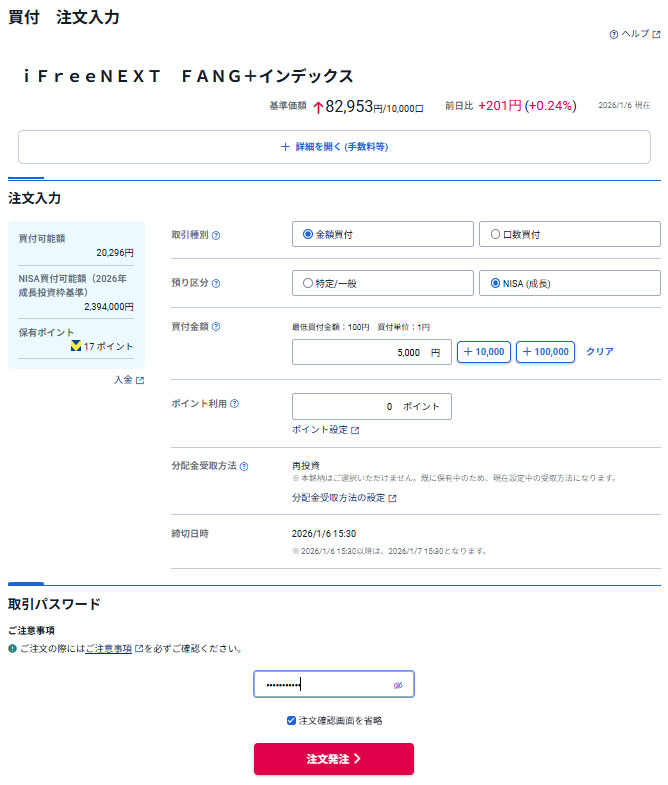 iFree NEXT FANG+インデックスを5,000円分買い注文|2026.1.6 FANG+が足元で下げているので「楽天レバナス売却」資金で5,000円追加します。 ポイントは使わずに全て口座の現金で5,000円分。インデックスなのでNISA口座です。 ロケット発射! 約定は1月8日です。下がれ~下がれ~www これで楽天レバナス売却による資金分は42,000円消費して残りは58,000円です。