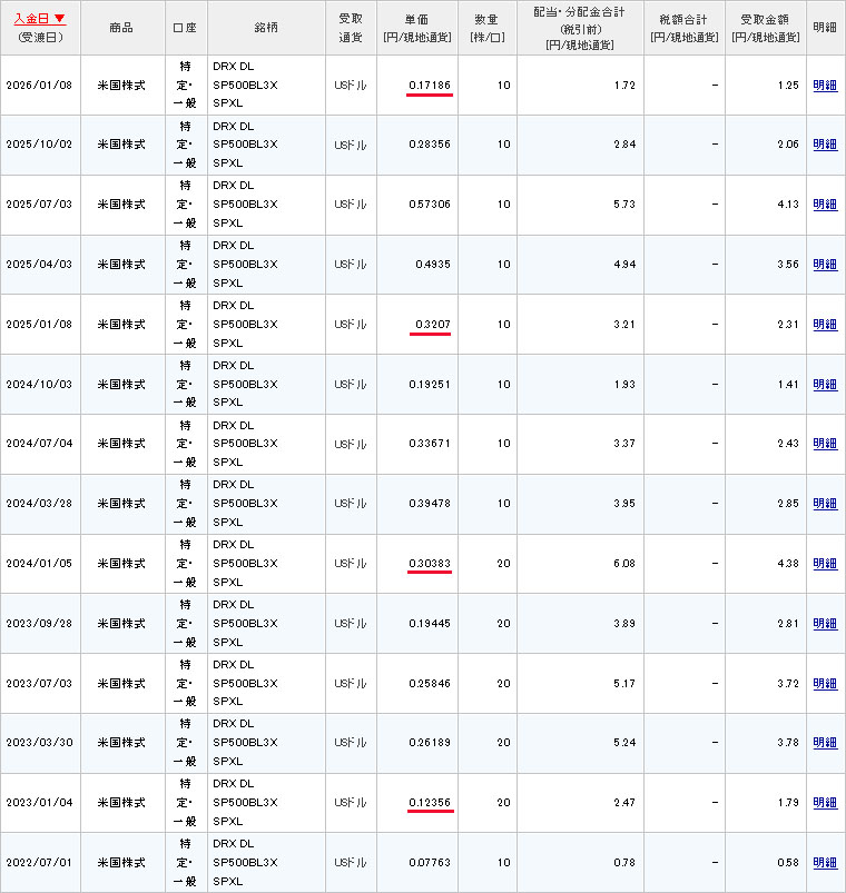 SPXLの分配金が入りました|2026.1.8 米国のETF、SPXL(S&P500ブルX3)から分配金が入りました。 10株保有していて分配金は$0.17186 $0.17186×10株=$1.7186 $1.7186×0.9=$1.54674 $1.54674×0.8=1.237392・・・で$1.25でした。 今回は稀に見る低さ・・・。 過去の1月の同期を見ても低い水準。2023年の$0.12356に近しい。 分配金が目当てではないのでまぁイイのですがここ数年で比較すると約半分でした。