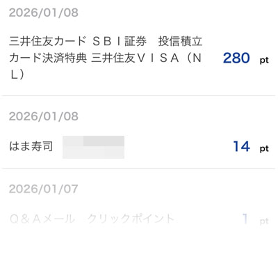 「三井住友カード SBI証券 投信積立カード決済特典 三井住友VISA(NL)」分の280ポイントと「はま寿司」での食事の支払い分、そして何時ものもろもろで合計312ポイントでした。
