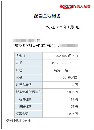 ライオン(4912)配当2023前期 コメントを残す 昨日の優待に続き配当が入金されました。 決算説明会にあったように1円プラスされ13円に! 税金を約200円も引かれ残りは1,036円・・・。 まぁ貰えないよりかはイイですけど100株ではこんなもんですねw