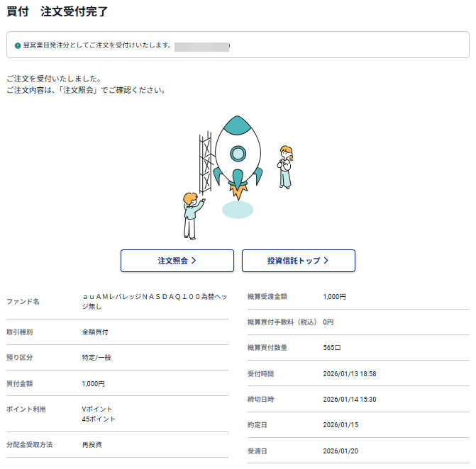 Vポイントが入ったのでauAMレバレッジNASDAQ100為替ヘッジ無しを1,000円分追加|2026.1.13
