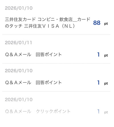 「三井住友カード コンビニ・飲食店_カードのタッチ 三井住友VISA(NL)」分の88ポイントとその他もろもろで計91ポイント。