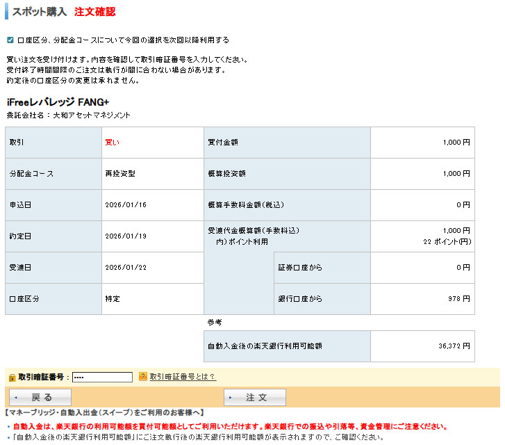 毎度々ですが「iFree NEXT FANG+インデックス」に1,000円分入れたので「レバレッジ」にも同じく1,000円分追加します。同日同額を入れるのが「FANG+」企画のルールです。