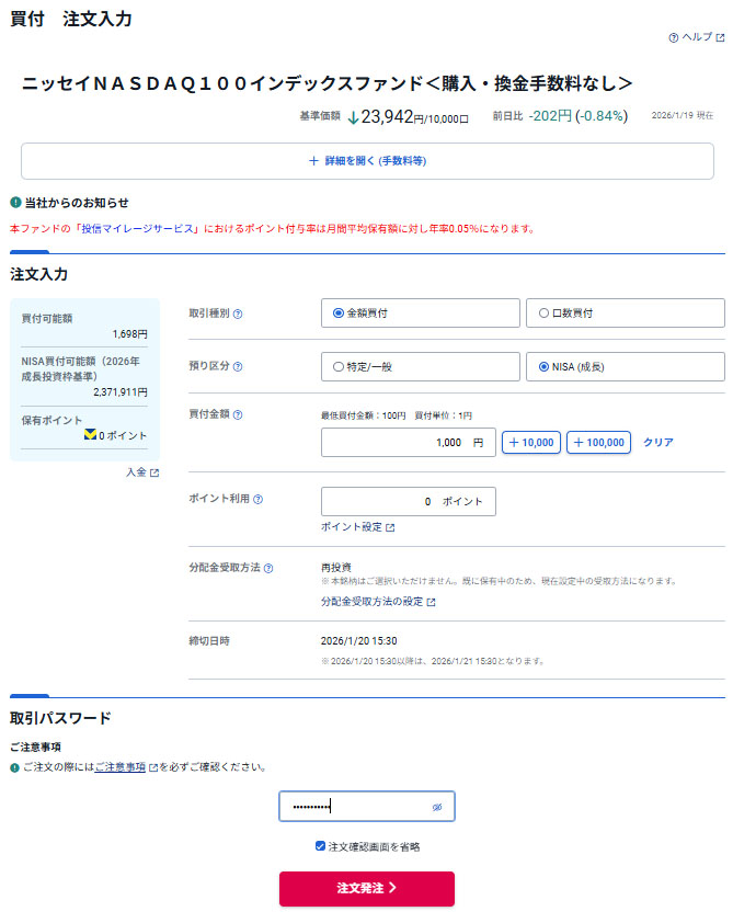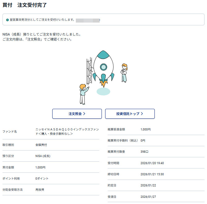 歩いて稼いだ資金を「ニッセイNASDAQ100インデックスファンド」へ|2026.1.20 レシチャレの申請していたドットマネーが現金化されたので「ニッセイNASDAQ100インデックスファンド」にそのまま1,000円入れます!コレが最後かも??? CYBERAGENTから楽天銀行口座に1,000円の入金! 「ニッセイNASDAQ100インデックスファンド」はNISA口座です。 ロケット発射! 約定は1月22日(木曜日)です。