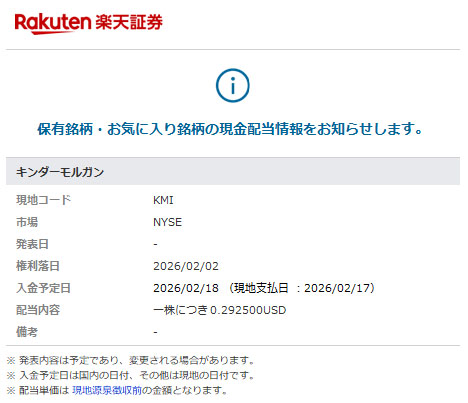 キンダー・モルガン(KMI)配当情報|2026.2月分 米国の高配当銘柄「キンダー・モルガン(KMI)」3月分の配当情報が楽天証券がからメールが届きました。 KMIは現在20株の保有です。 ========(以下、コピペw)======== $0.2925×20株=$5.85 $5.85×0.9=$5.265 $5.265×0.8≒$4.212・・・で前回は$4.20でした。 ===========================