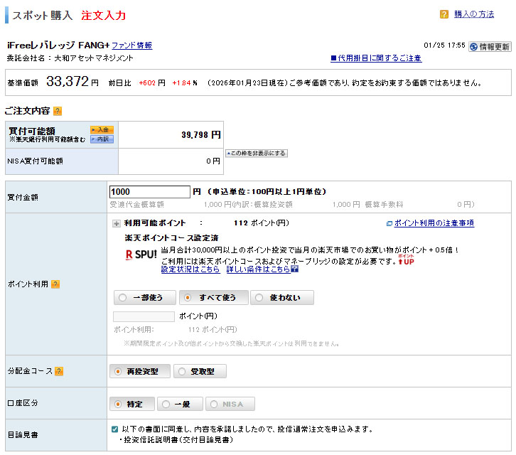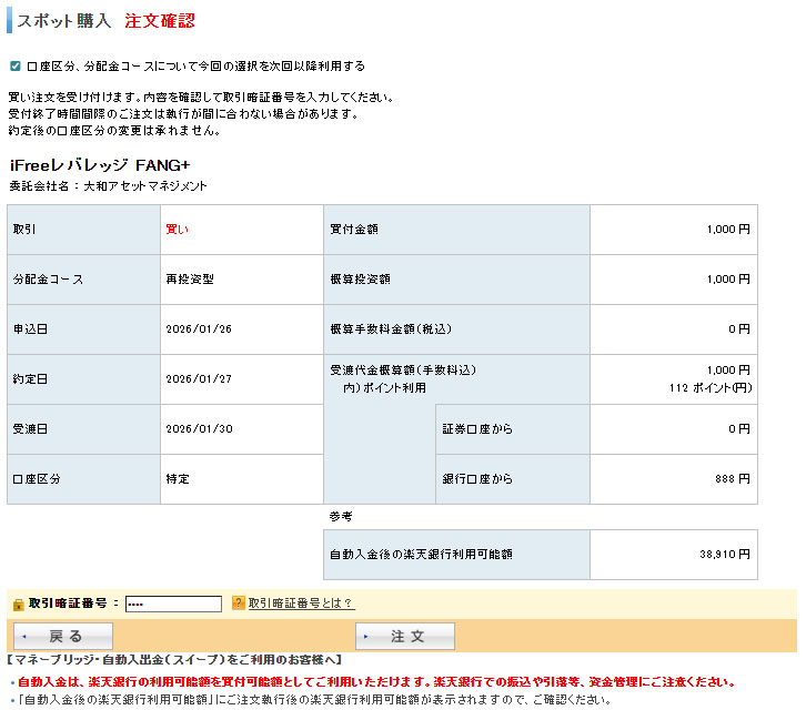 投資に使える楽天ポイントが112ポイントあったので「すべて使う」にして現金は楽天銀行口座から888円スイープ。