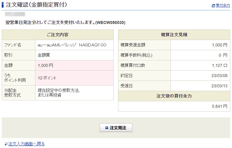 Vポイントが入ったのでauAMレバレッジNASDAQ100を1,000円分追加|2023.3.6 コメントを残す 続いて「auAMレバレッジNASDAQ100」にも何時もの様に1000円です。 支店口座へのダイレクトログインでも5ポイント付いていました。 ATM取引分は20ポイントでした。 残りのポイントを「すべて利用する」 こちらの口座からの持ち出しは988円 受付完了! 先週末にNASDAQが上昇したので現在はプラテンしていますw