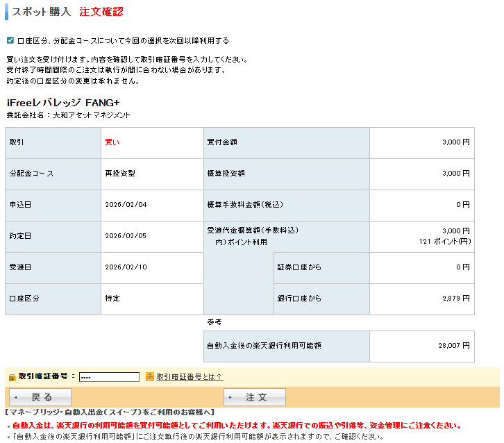 iFree レバレッジ FANG+を3,000円分買い注文|2026.2.3 「インデックス」に入れたのでレバレッジにも3,000円分投入! 同日同額を入れるのが「FANG+」企画のルールです。 レバレッジの方は楽天証券の特定口座で運用中。 ポイントは全て使うで121ポイント。現金は2,879円が楽天銀行口座からスイープ。 約定はインデックスと同日の2月5日(木曜日) 注文完了! 今回は楽天レバナス売却による資金からでこれで50,000円消費して残りは50,000円です。折り返し地点。こちらのレバはマイナス中なのでこの安値のウチに入れたいのだが・・・。