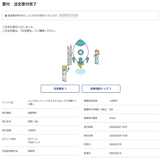 Vポイントが入ったので「auAMレバレッジNASDAQ100為替ヘッジ無し」へ何時ものように1,000円分追加します。