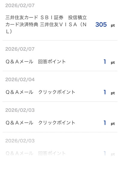 「三井住友カード SBI証券 投信積立カード決済特典 三井住友VISA(NL)」分の305ポイントとその他、いつもの細かいもので合計311ポイントです。