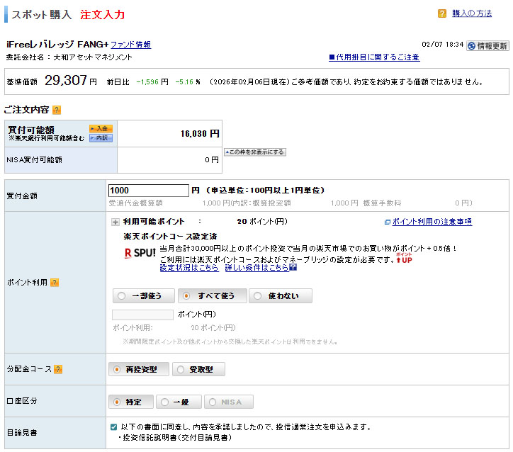 レバレッジなので特定口座です。同ファンドを既に他の企画でSBI証券で運用してるためこちらは楽天証券口座で運用しています。