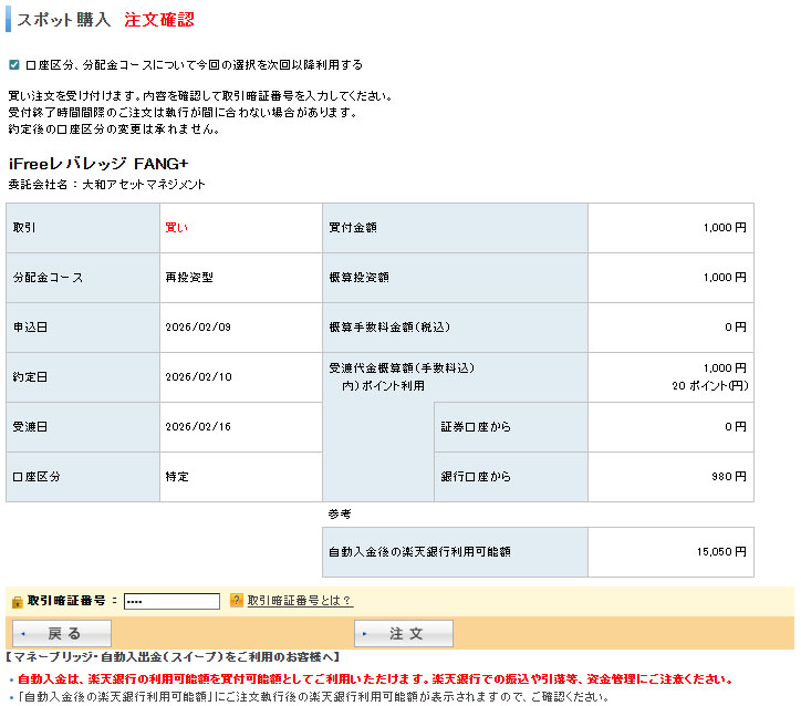 「インデックス」に入れたので「iFree レバレッジ FANG+」へも1,000円分追加します。