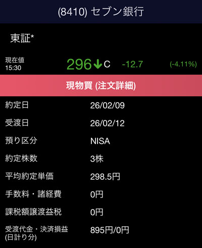これで「セブン銀行」は全てNISA口座で73株の保有になり平均取得単価は286となりました。