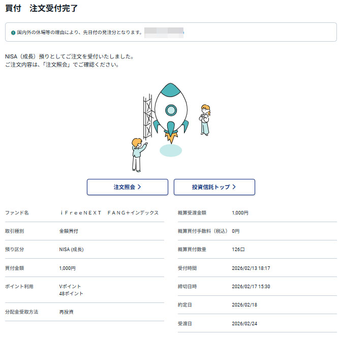 今回は楽天レバナス売却による資金からではなくVポイント投資です。
