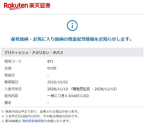 ブリティッシュ・アメリカン・タバコ(BTI)配当情報 2026.11月分|2026.2.17 5月分、8月分と同時に「ブリティッシュ・アメリカン・タバコ」11月分の配当情報メールも楽天証券から届きました。 BTIは現在2株の保有。 ========(以下、コピペw)======== $0.834851×2株=$1.669702 $1.669702×0.8≒$1.33・・・でしょうか? ===========================