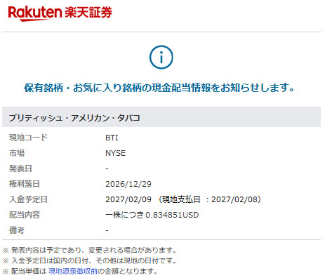 5月分、8月分、11月分と同時に「ブリティッシュ・アメリカン・タバコ」来年2月分の配当情報メールも楽天証券から届きましたwww 1年も先ですw 減配もしない代わりに増配もしないぞ!という決意でしょうか???笑