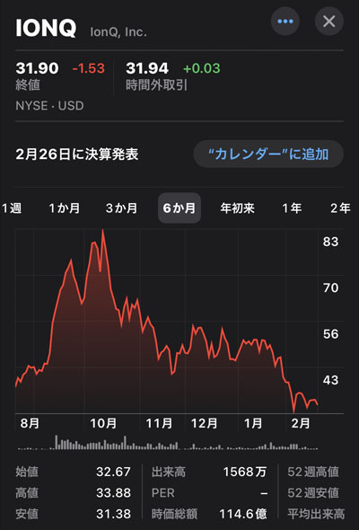 イオンキュー(IONQ)|2026年2月20日|$31.90 久しぶりの「IONQ」ネタです。 いや~ 下がりましたね。 一時は$80超えだったのですが・・・。 個人的にはもう恩株だしあまり気にもならないのですが正直少し寂しい感じもw もうテーマで上昇するフェーズではない感じもしますし、やはり早期に黒字化して早い段階でマネタイズできれば・・・。今は細かいM&Aをやってるみたいですけど。 今後、爆発的に〇〇〇バガーとかってもう量子で覇権とらないとないんじゃないかな~ まぁ買った時期にもよりますが。