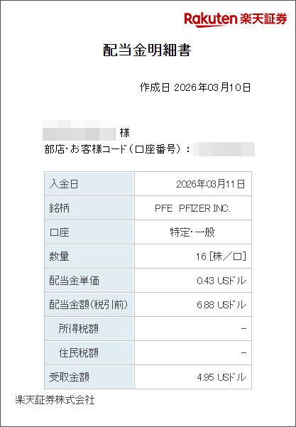 米国の高配当銘柄「ファイザー(PFE)」から配当が入りました。