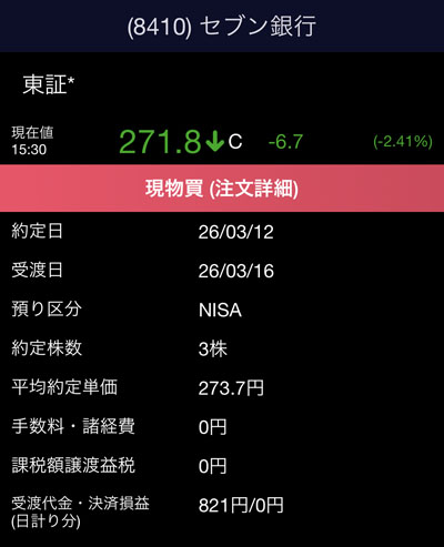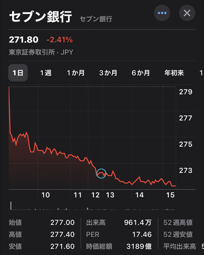 そこで超低位株の「セブン銀行」を5株買うことにしました。セブン銀行の今月分はすでに3日に購入済みなのですが280を割ったので追加します。