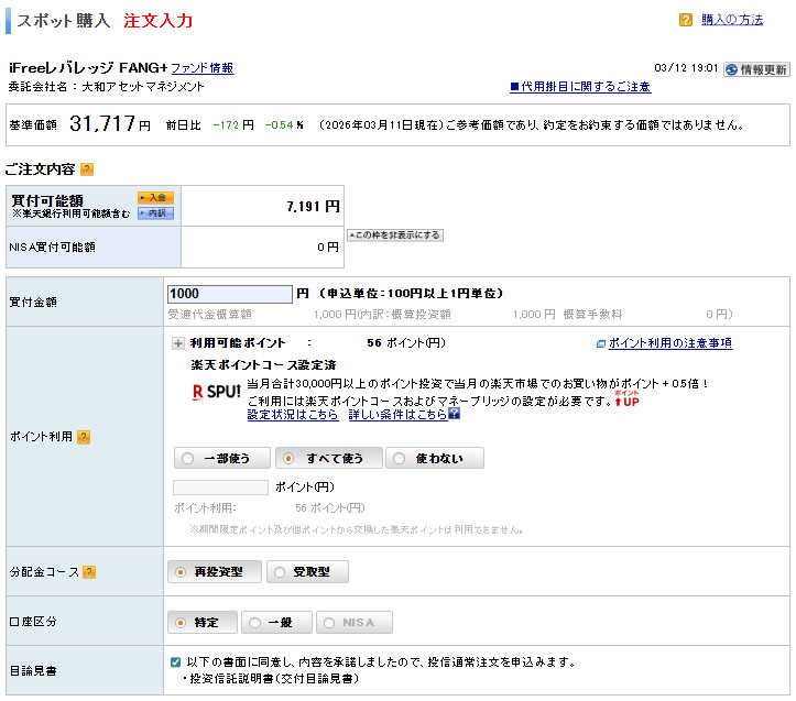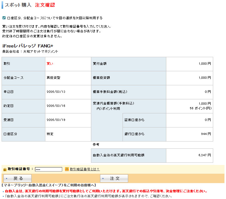 iFree レバレッジ FANG+を1,000円分買い注文|2026.3.12 「インデックス」に1,000円入れましたので「レバレッジ」にも同額を・・・。 レバレッジのなので特定口座・・・なので楽天証券。楽天ポイント消費に利用しています。 その楽天ポイントが56ポイント使えるので「すべて使う」で現金は944円の出金。 約定はインデックスと同日の週明け3月16日(月曜日) 「注文完了」! こちら「iFree レバレッジ FANG+」は、まだまだマイナス街道まっしぐらwww まぁ我慢の為所でしょうww そのうち騰がりますって・・・w。 今回も楽天レバナス売却による資金からではなく楽天ポイント他の別資金からになります。