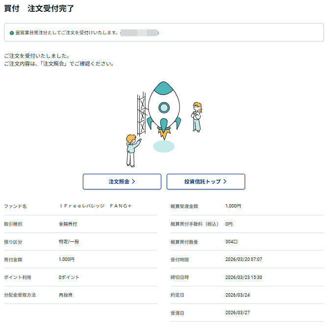 「レシチャレ」のコインが貯まり換金できたので「iFreeレバレッジFANG+」へ1,000円入金しました。本来「レシチャレ」なので「ニッセイNASDAQ100インデックスファンド」なのですが間違えました・・・笑 現在、換金手続き中の「トリマ」分を「ニッセイNASDAQ100インデックスファンド」に振り替えます。