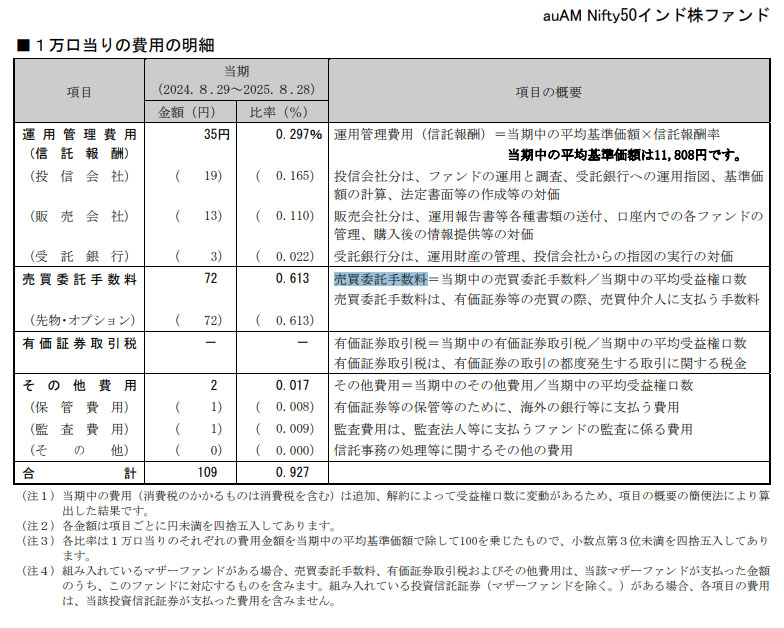 yahooファイナンスの「auAMインドNifty50」の掲示板を見ていたら “経費率1%超え” で手放したというポストがあり 「え?」と・・・ だってインドファンドの中で手数料が当時最安だったのでここを選んだのに。。。 実際、そのyahooファイナンスの情報でも「信託報酬」0.297%とある。 そりゃ隠れコストの存在も知ってるし当然このファンドにもあるだろうとは思っていましたが・・・。 別のポストで “売買委託手数料がめちゃくちゃかかってる” とありました。 そうなんだと思いファンドのページを確認してみると 確かに!「売買委託手数料」が0.613%もある! 合計で0.927%!!! こりゃ~騰がりませんw まぁそれでも2年前ぐらいまでは良かったのですが・・・。私が買ってからは。。。これ見て私も撤退することにしました。