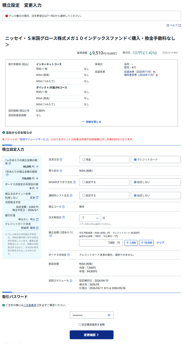 ニッセイ・s米国グロース株式メガ10の積立を月々7,000円に変更|2026.3.20