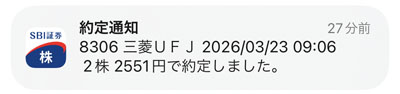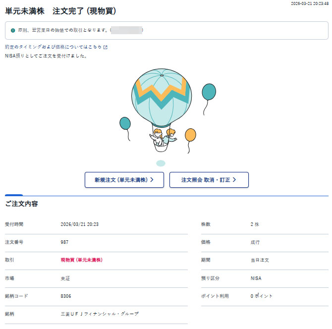 NISA成長投資枠で単元未満で2株。SBI証券なので成行注文です。