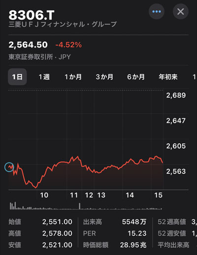 こちらも前回、戦争がはじまって直ぐに追加購入した「三菱UFJフィナンシャルグループ」ですが、そこから更に下がったのでまだプラスではありますが2株だけ追加します。