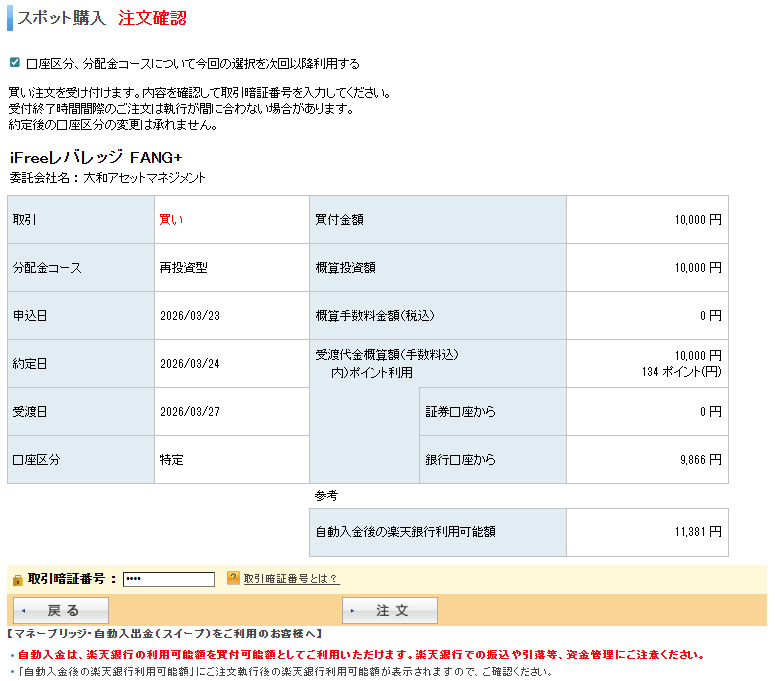 今回は楽天レバナス売却による資金と楽天ポイントからでトータル63,000円消費して残りは37,000円です。