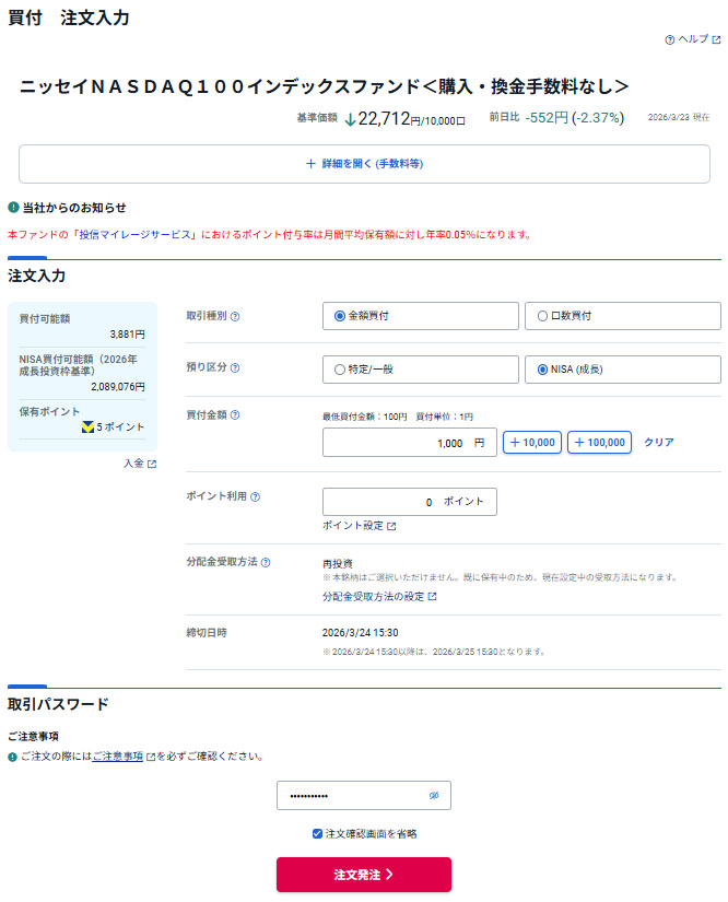 申請していた「トリマ」マイル分のドットマネーが現金化され振り込まれたので「ニッセイNASDAQ100インデックスファンド」へそのまま1,000円入れます。