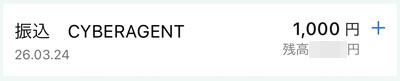 三井住友銀行口座にCYBERAGENTから1,000円の入金。