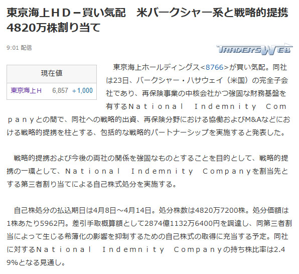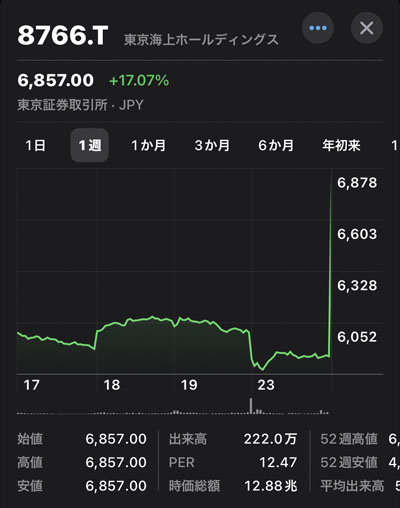 東京海上ホールディングス(8766)の株価が急騰しました!