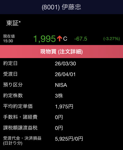 これで「伊藤忠商事」はNISA口座で50株の保有となり平均取得単価は1,753。
