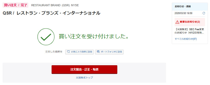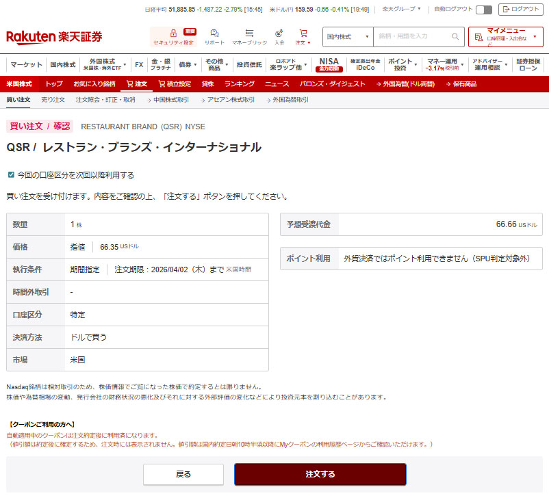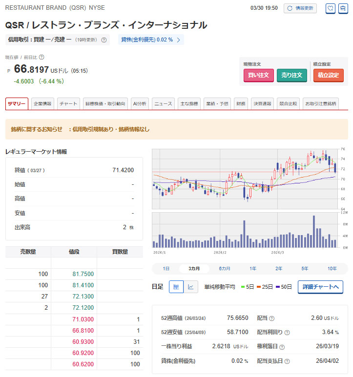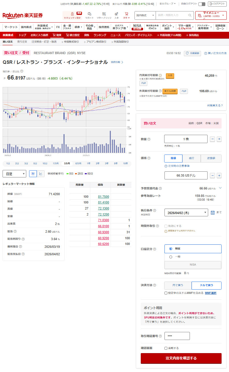 レストラン・ブランズ・インターナショナルを買い注文|2026.3.30 楽天証券のポートフォリオを見ると「レストラン・ブランズ・インターナショナル」がプレで大幅に下げている! -6.44%の下落です。。。 $70を割り込んで$66台まで下がってきました。 ここは1株追加したい・・・と思い $66.35で指値注文を入れました。 期間は4月2日の木曜日まで。金曜日までにしようかと思ったら選択できなかったので市場がお休みのようです。※「グッドフライデー(聖金曜日)」のため休場だそうです。 1株、$66.35の指値。資金はSOXLの売却益です。 買い注文を受け付けました。 刺されば当然約定なのですが$66.35で刺さらなかった場合、今回は流します。。。 下げの勢いがあるようですので多分・・・。