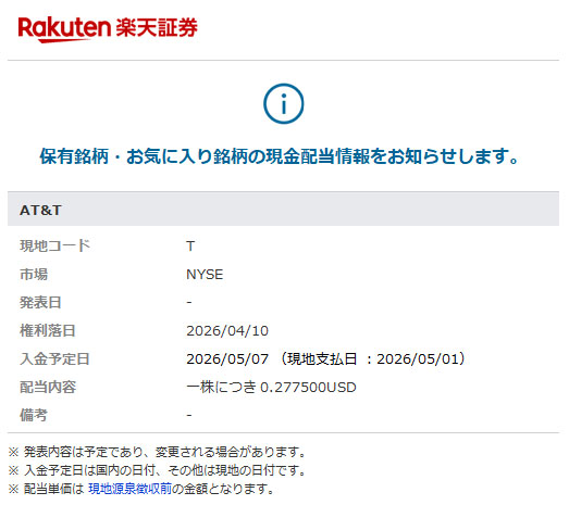 AT&T(T)配当情報 2026.5月分|2026.4.1 米国の高配当銘柄「AT&T(T)」の5月分配当の情報メールが楽天証券から届きました。 AT&Tは22株の保有です。 ========(以下、コピペw)======== 配当は$0.2775と前回、前々回、前前々回、前前前々回・・・と同じ $0.2775×22株=$6.105 $6.105×0.9=$5.4945 $5.4945×0.79685=$4.37829・・・で、前回は$4.40でした。 ===========================