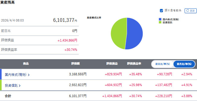 下げ相場で多めに入金してますので4桁はキープしましたが先月より総資産は目減り。。。