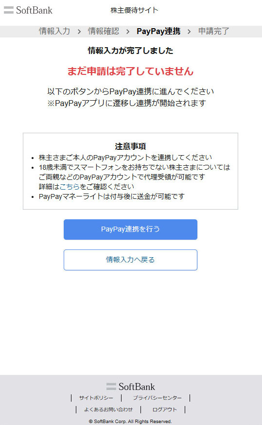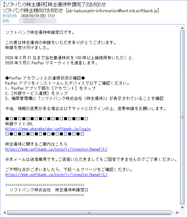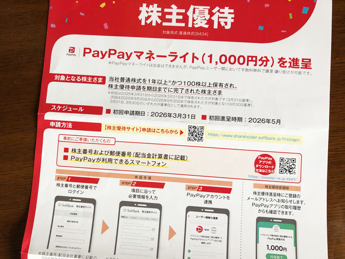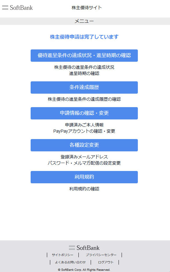 NTTの優待「dポイント」は1回(ないし2回)だけのようなのでどうでもイイかな?と思っていますがソフトバンクのこれは毎年付与されるとの事なので1回1,000円分は大きいと思って登録してみました。