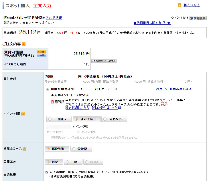 投資に使えるポイントが231ポイントあったので「すべて使う」にして現金は楽天銀行口座から6,769円スイープ。