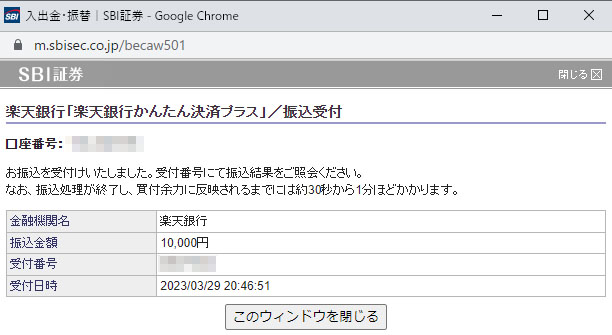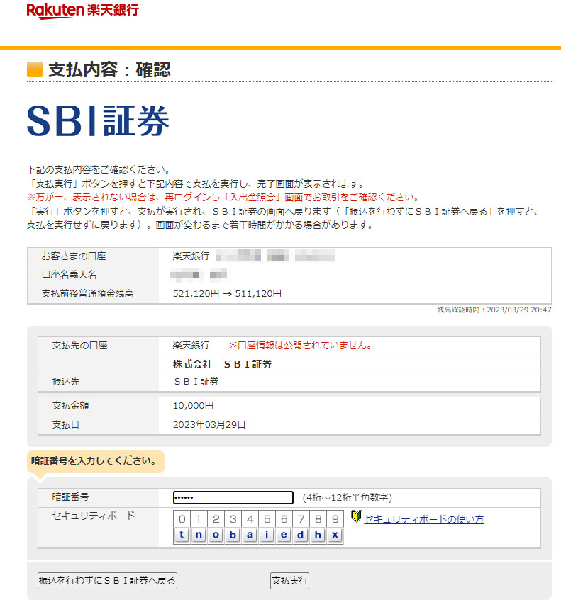 資金移動(楽天銀行→SBI証券) SBI証券の口座に資金が無くなったので楽天銀行から流入します。 まずはSBI証券の「入出金・振替」から『入金』 履歴が残っているので私の場合は楽天銀行が表示されています。 今回は10,000円移動します。今月来月と納税が重なるので資金不足です。。。 次に楽天銀行のサイトが呼び出されログイン後、情報を入力 完了です! 以前、楽天銀行の無料振込分が消費されると書きましたが手数料無料で移動できます。