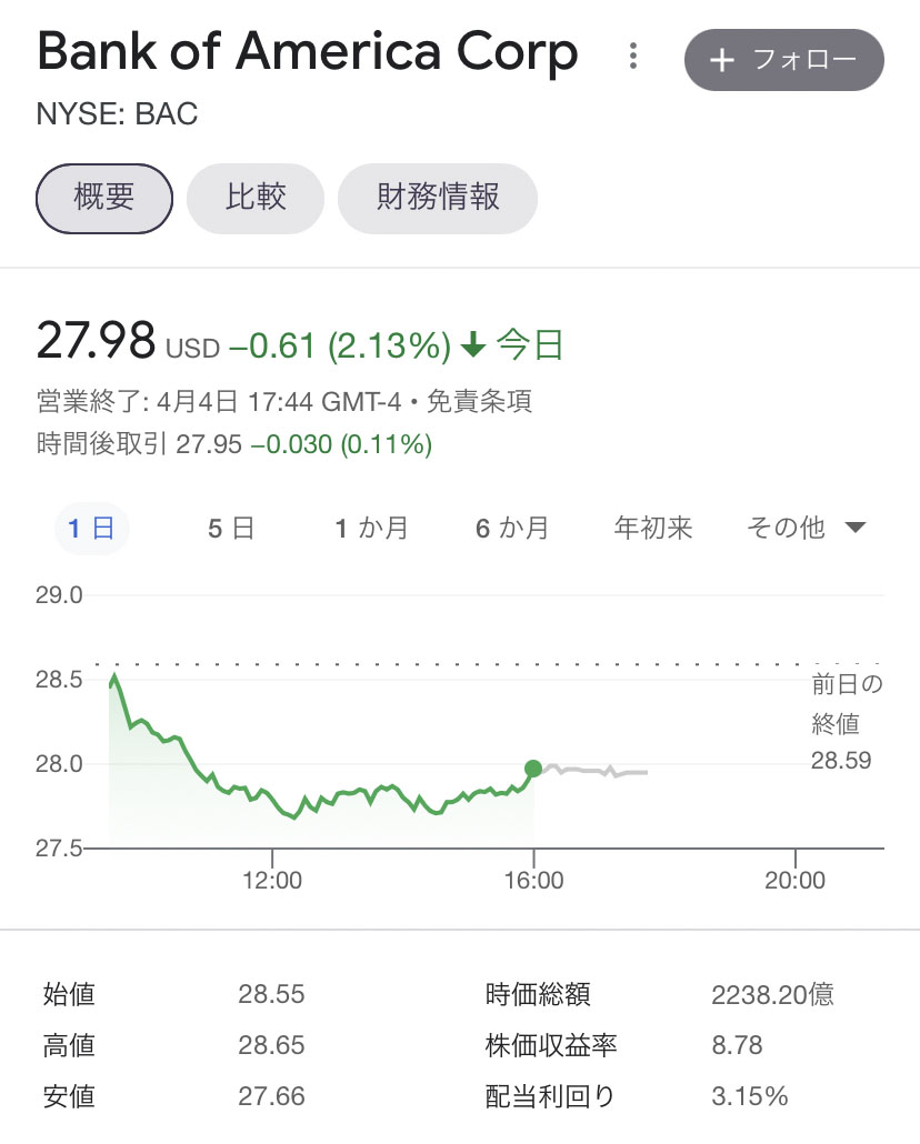 またも銀行株。今度は米国の個別銘柄バンク・オブ・アメリカ(バンカメ)