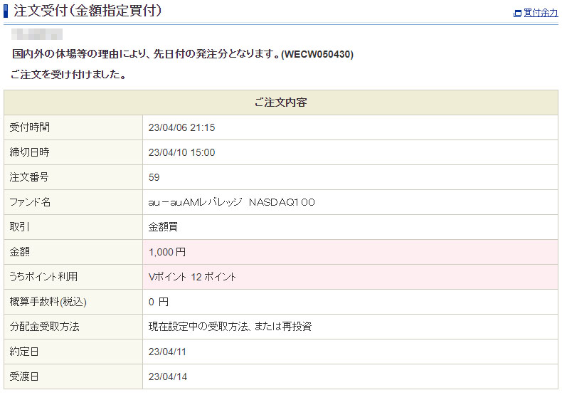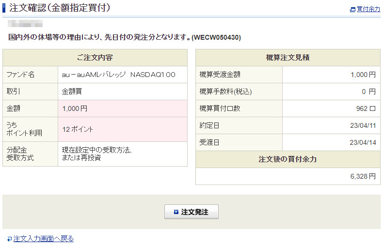 Vポイントが入ったのでauAMレバレッジNASDAQ100を1,000円分追加|2023.4.6 「auAMレバレッジNASDAQ100」にも半分の12ポイントを利用して1,000円分追加します。 こちらは「すべて利用する」で残り分の12ポイントを 口座からの持ち出しは988円 んで、こちらも火曜日の約定です。